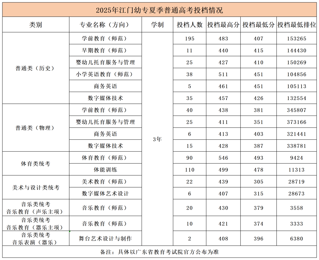 广东江门幼儿师范高等专科学校2025年夏季高考录取结果查询,各专业分数及排位